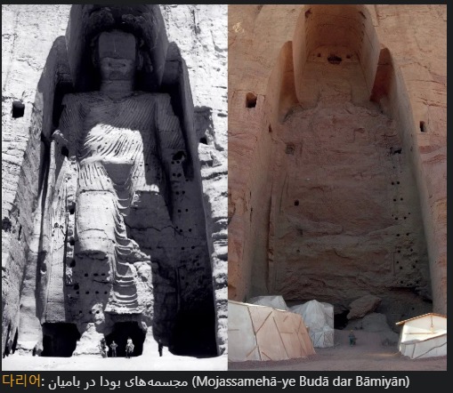참고 : 아프가니스탄 바미안 주에 위치했던 고대 아프가니스탄의 석굴사원 및 불상 2구로 2,001년에 탈레반에 의해 파괴되었다. 파괴된 후인 2,003년에는 이 석불이 있던 벽감과 주변에 있는 100개가 넘는 동굴, 크고 작은 불상들, 요새 유적들이 유네스코 세계유산으로 등재됨과 동시에 위험에 처한 세계유산에 지정되었다.